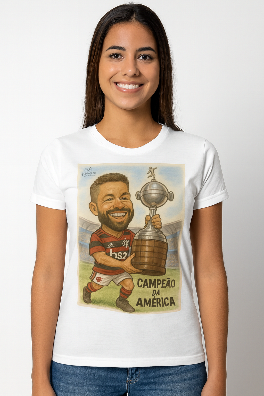 Estampada com uma caricatura vibrante de Diego Ribas erguendo a taça da Copa Libertadores da América, esta peça celebra o título inesquecível do Flamengo. Produzida em 100% algodão de alta qualidade, oferece conforto e durabilidade, perfeita para colecionadores e apaixonados pelo futebol. Um item único para vestir com orgulho e guardar como lembrança de um momento eterno do futebol sul-americano.